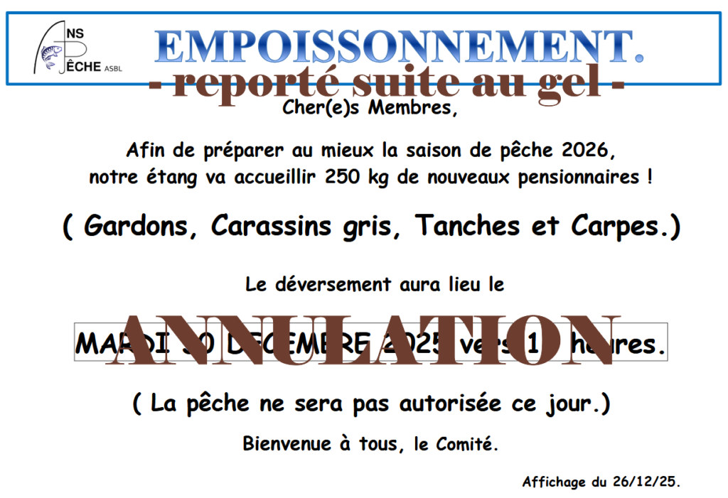 - Suite au gel, l’empoissonnement prévu a du être reporté. Une nouvelle date vous sera bientôt communiquée.